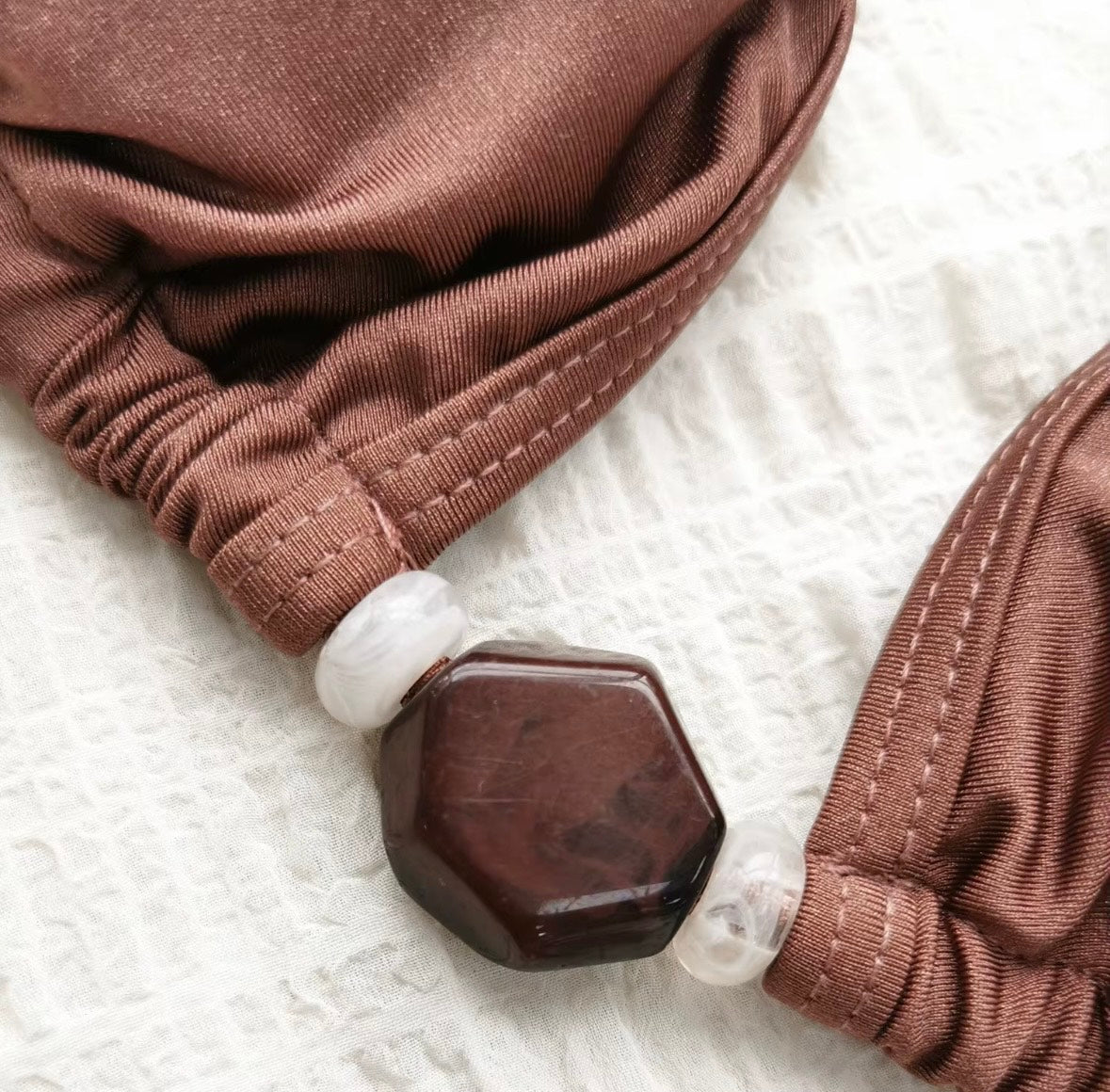 Maillot deux pièces à la teinte chaude et lumineuse, sublimé par de délicates perles pour un look naturel, chic et ensoleillé.